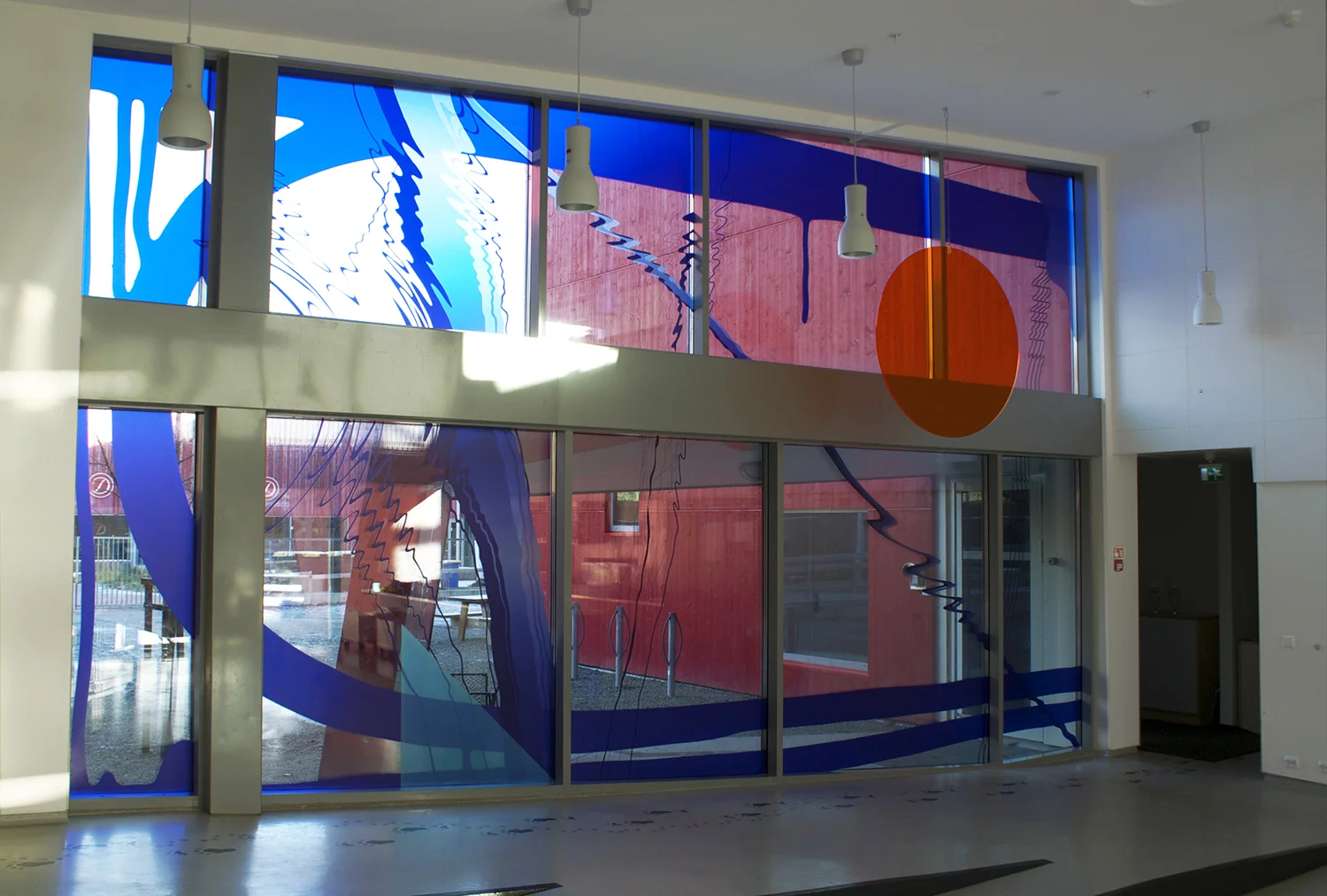 Motivet er vekselvis trykket med dekkende og transparente farger, dette for å gi et spill i overflaten og for at motivet skal slippe igjennom lys. Sirkelen i pleksiglass henger fritt fra taket og påvirkes av luft og aktiviteter i rommet.