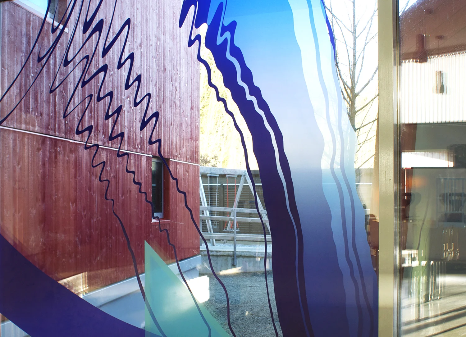 Den oransje fargen i pleksiglasset er komplimentærfarge til den blå fargen som er brukt i linjene, to komplimentærfarger som blander seg blir en nøytral gråsort. Dette var noe barnehagen kunne bruke som del av pedagogisk opplegg i etterkant.